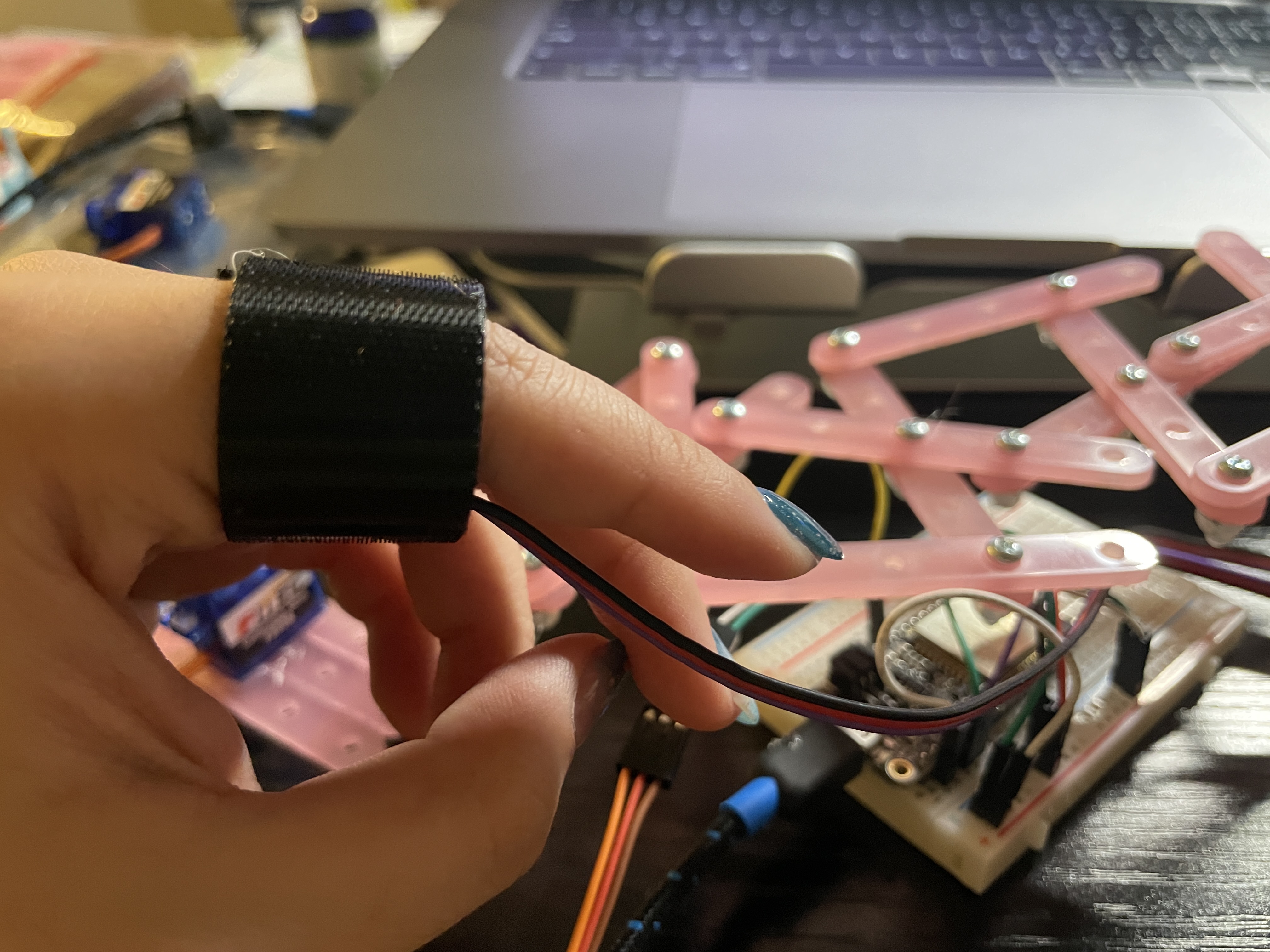 This installation is made of several parts. First, a pulse sensor that can detact human heart pulse by analyzing the change of incoming light. The sensor will upload data to the ESP 32 board, and transfer the data to the built-in led light and the servo motor. The movement of the sevo motor will lead to a “pulse” effect on the laser cut structure